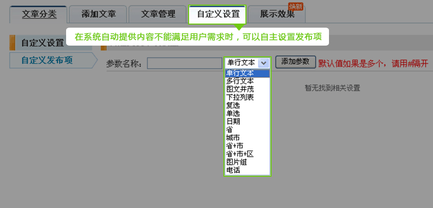 自(zì)定義設置:是(shì)在系統自(zì)動提供內(nèi)容不(bù)能(néng)滿足用(yòng)戶需求時(shí),您可(kě)以自(zì)主設置發布項。