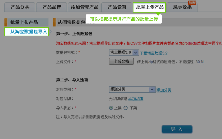 批量上(shàng)傳産品:可(kě)以根據提示進行(xíng)産品的(de)批量上(shàng)傳。目前我們隻支持從(cóng)淘寶進行(xíngλ)批量上(shàng)傳。